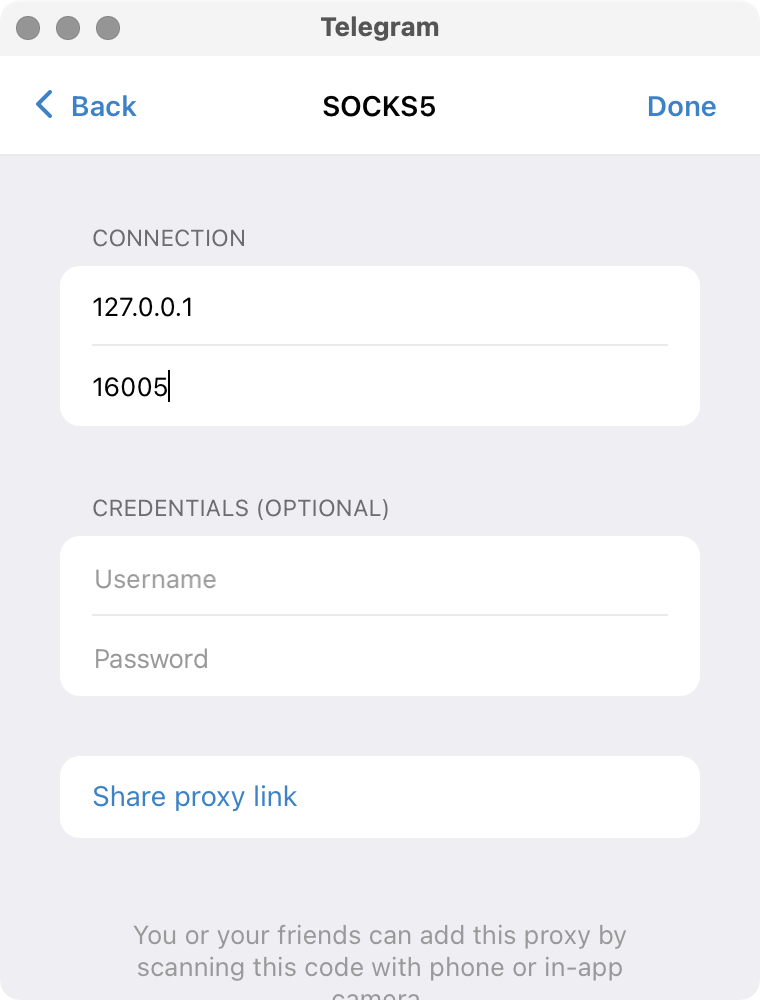 Enter the connection info as shown in our screenshot and click Done.