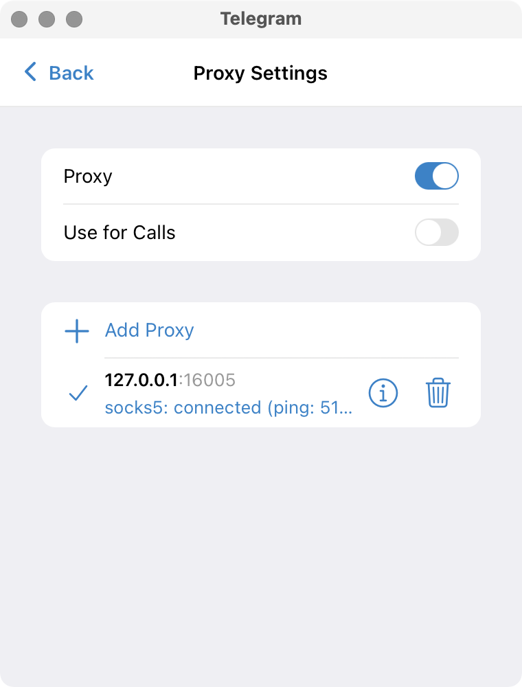 The Proxy Settings screen should now show the proxy as connected.