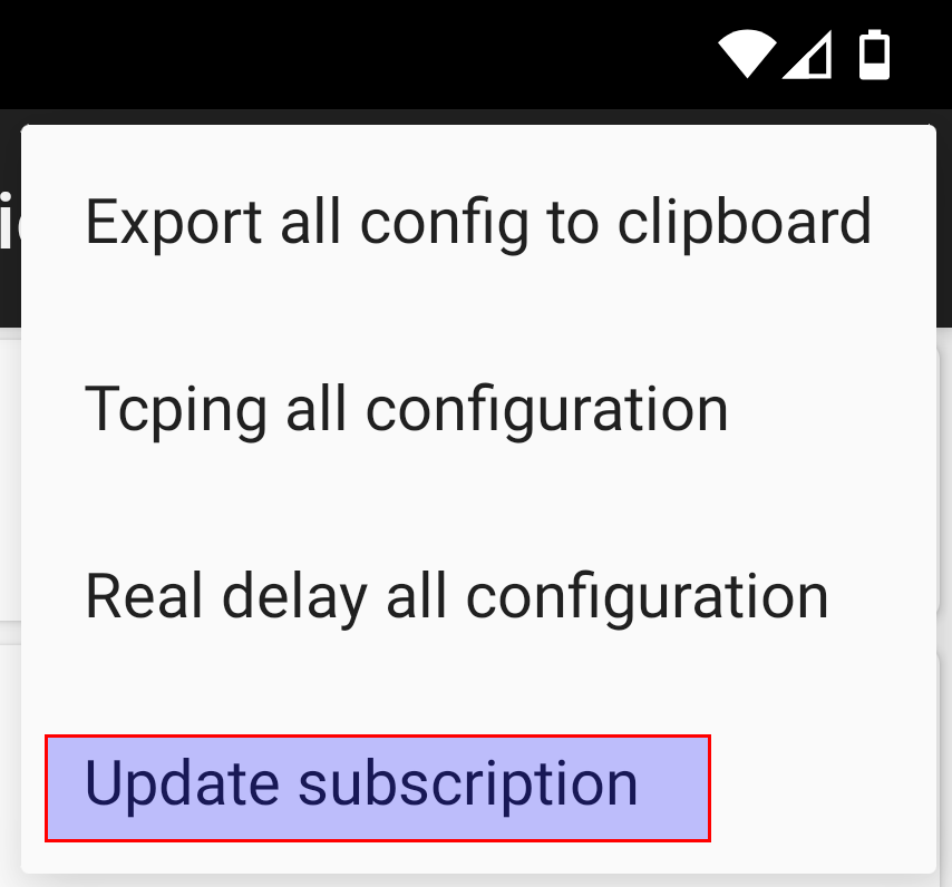 IMPORTANT: you should never have more than 1 subscription in the v2rayNG app. If you have more than one, updating the server list may fail. Check the Subscription group setting in the left-hand menu to ensure you have only one entry.